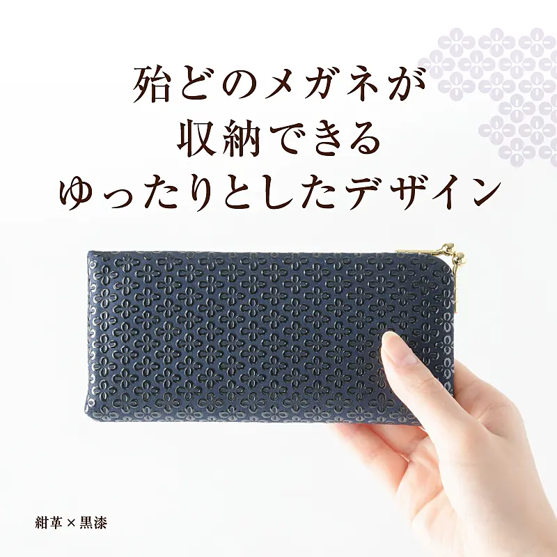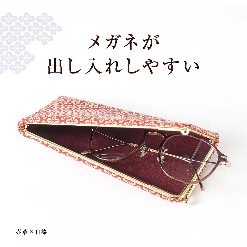 がま口タイプのメガネケースです。片側上部が大きく開き、メガネが出し入れできます。