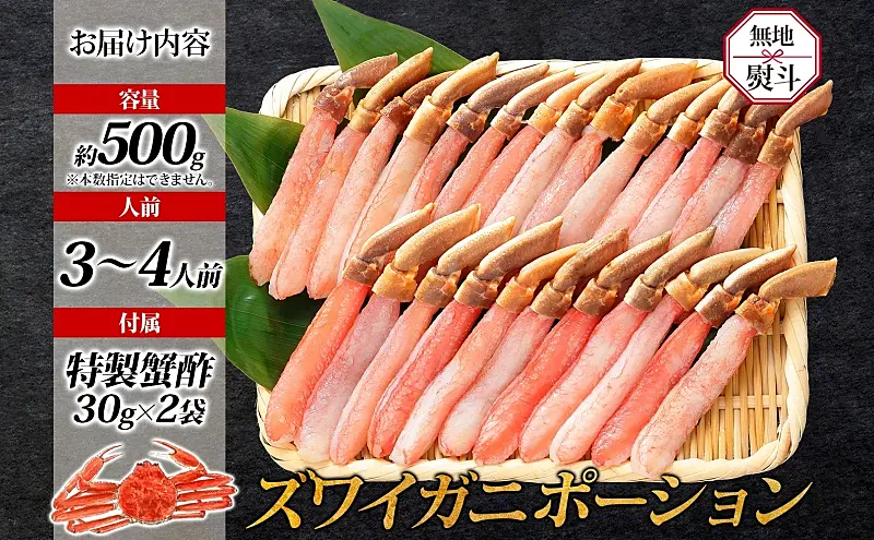 020C439-1 【無地熨斗】ズワイ蟹 ポーション 500g前後 生食可 蟹酢付 約3-4人前 昆布塩加工 しゃぶしゃぶ かに