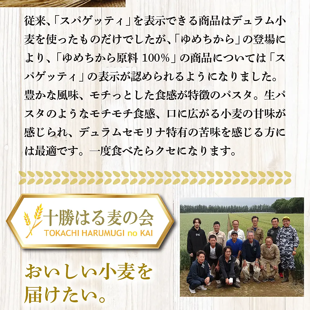 従来、「スパゲッティ」を表示できる商品はデュラム小麦を使ったものだけでしたが、「ゆめちから」の登場により、「ゆめちから原料100%」の商品については「スパゲッティ」の表示が認められるようになりました。