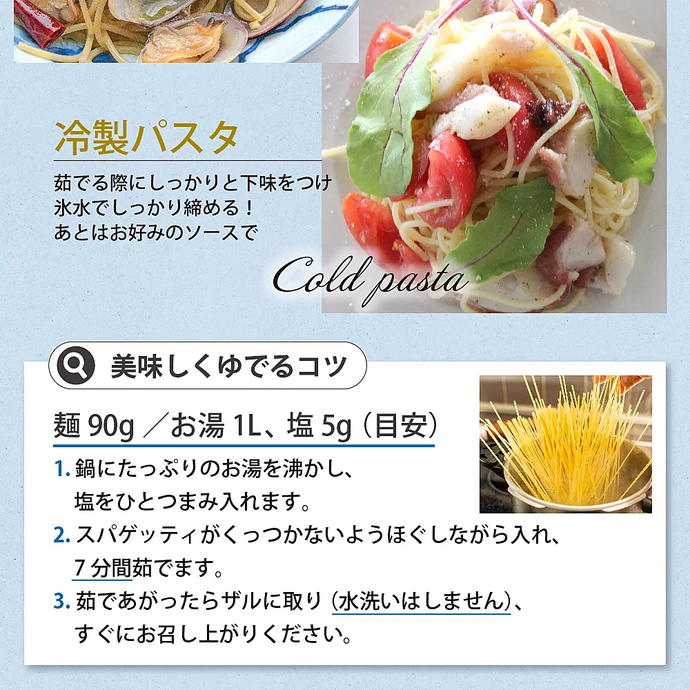 1袋(270g)3食入り(90g×3束)で、標準茹で時間は7分間、賞味期限(開封前)は約3年で、常温保存が可能です。生パスタのような驚くほどもちもちの食感を是非お楽しみ下さい!