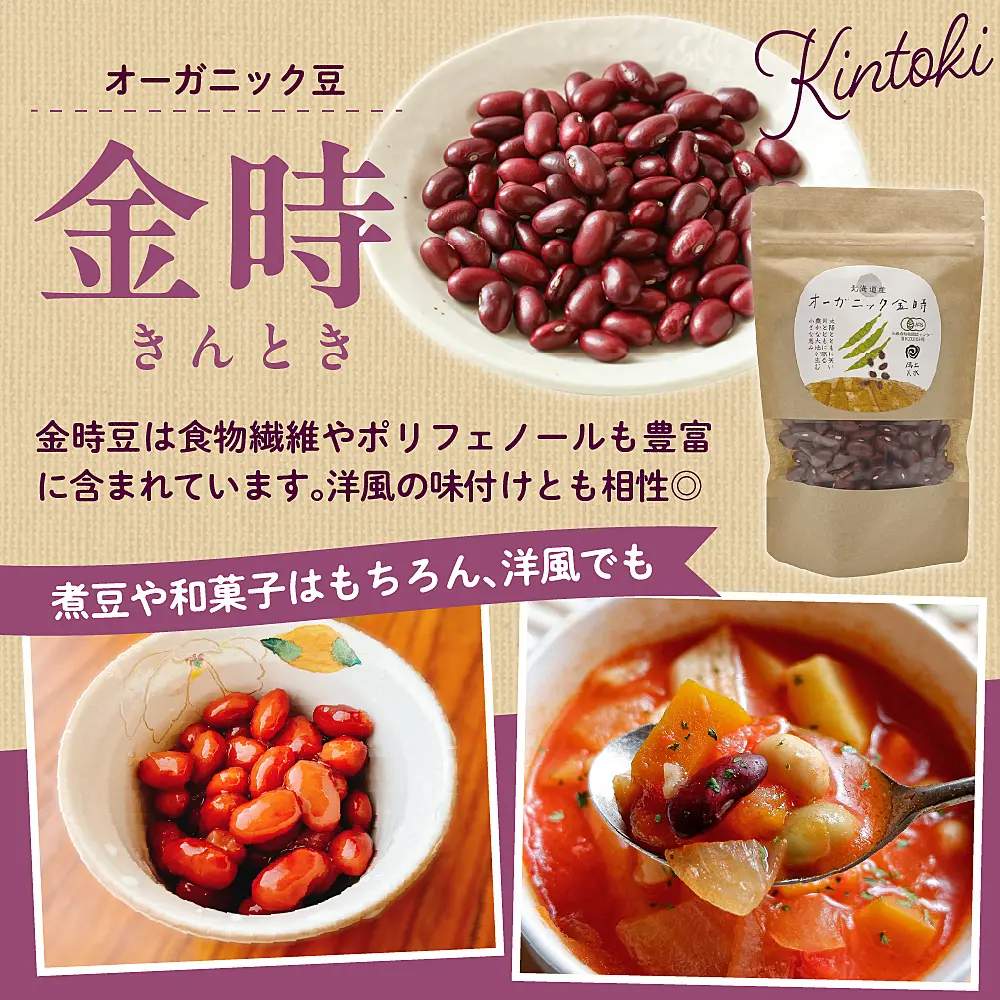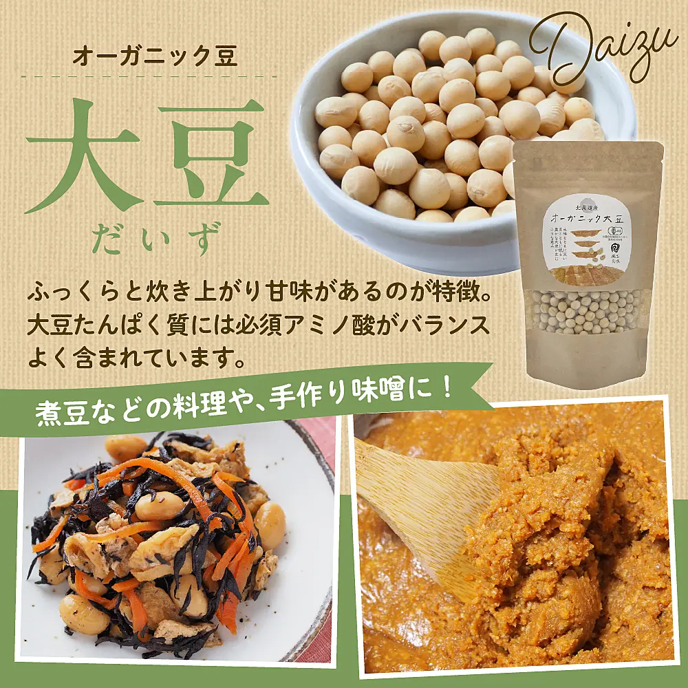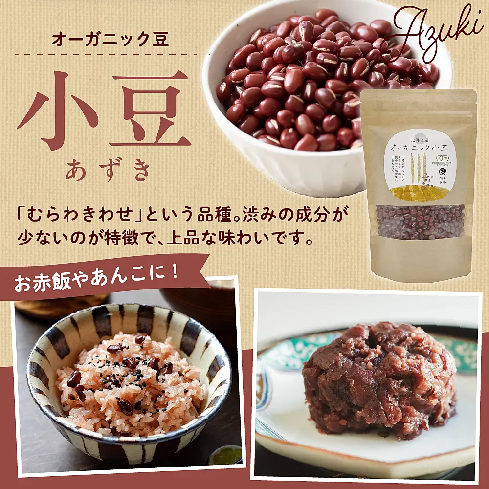 北海道の大地でのびのびと育ったピカピカのお豆たち。生産工程はもちろん、自社工場の選別、袋詰め工程でも有機JAS認証を取得し、完全な管理のもと製品化しています。北海道産オーガニック小豆=「むらさきわせ」という品種、渋みの成分が少ないことが特徴で上品な味わいがあります。あんこ作りやお赤飯に。北海道オーガニック大豆=ふっくらと炊き上がり甘みがあります。煮豆や惣菜などにはもちろんのこと、お味噌の材料にも。大豆タンパク質には必須アミノ酸がバランスよく含まれています 北海道オーガニック金時=甘く調理されることの多い金時豆ですが洋風の味付けとも相性良し。金時豆は食物繊維とポリフェノールが豊富に含まれています。 北海道オーガニック黒豆=大粒で煮崩れしにくく、料理はもちろんのこと和菓子作りにも最適です。