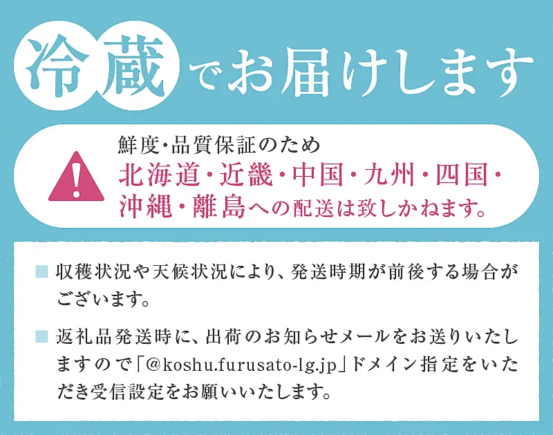・返礼品発送時に、出荷のお知らせメールをお送りいたしますので「@koshu.furusato-lg.jp」ドメイン指定をいただき受信設定をお願いいたします。