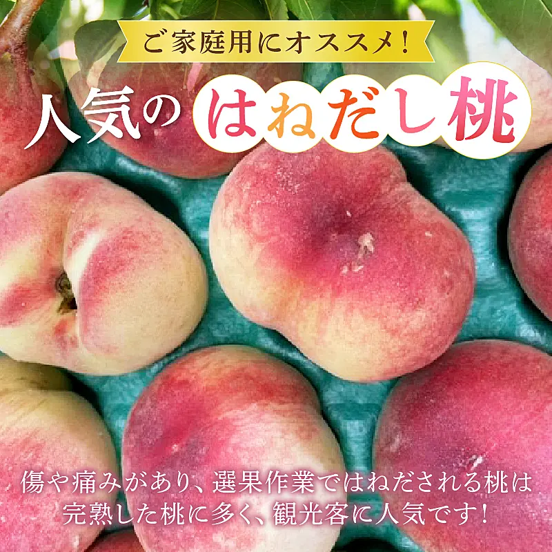 そんな甲州市では、旬の時期になると日本全国に向けて美味しい桃を出荷するために日々選科作業が行われますが、その過程で傷や痛みがある桃は廃棄されたり加工用に回されたりします。この傷や傷みの多くは完熟した桃に多く見られるため、はね出し品として山梨県を訪れる観光客の中ではとても人気があります。農家の方が丹精込めてつくったのに、本来であれば廃棄したり加工したり、直接食べてもらうことのない完熟した桃を約3kgでお届けします。今話題の『フードロス』や桃農家の『もったいない』を形にしました。