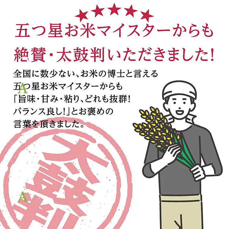 「甘味が強いお米」と、五つ星お米マイスターからも太鼓判をいただきました。