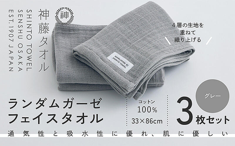 010B1796 神藤タオル「ランダムガーゼ・フェイスタオル」(グレー)3枚セット