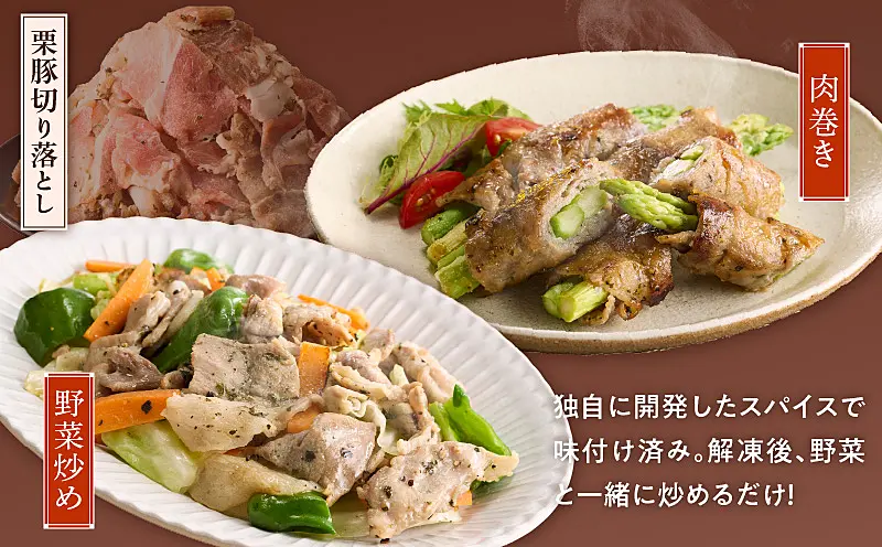 G3374 栗豚 3種セット 合計 1.8kg(ステーキ/切り落とし/生姜焼き用)【オリジナルスパイス仕込み 豚肉】