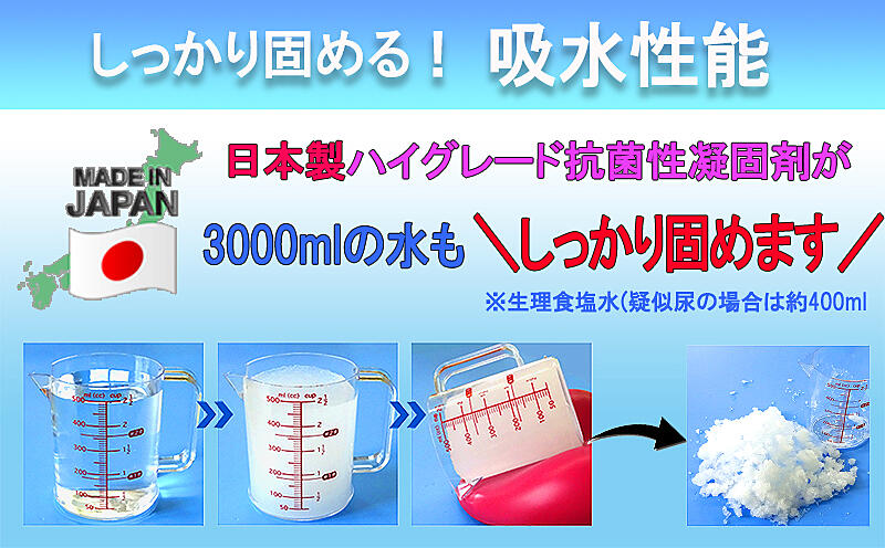 ・抗菌性凝固剤で抗菌(大腸菌、黄色ブドウ状球菌等)及び消臭(アンモニア臭等)効果が長期間持続します。(公的機関検査済み)