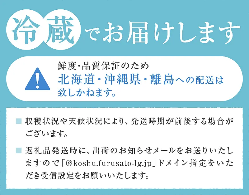 ・返礼品発送時に、出荷のお知らせメールをお送りいたしますので「@koshu.furusato-lg.jp」ドメイン指定をいただき受信設定をお願いいたします。