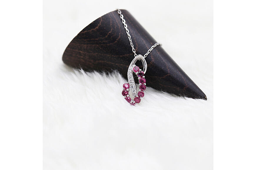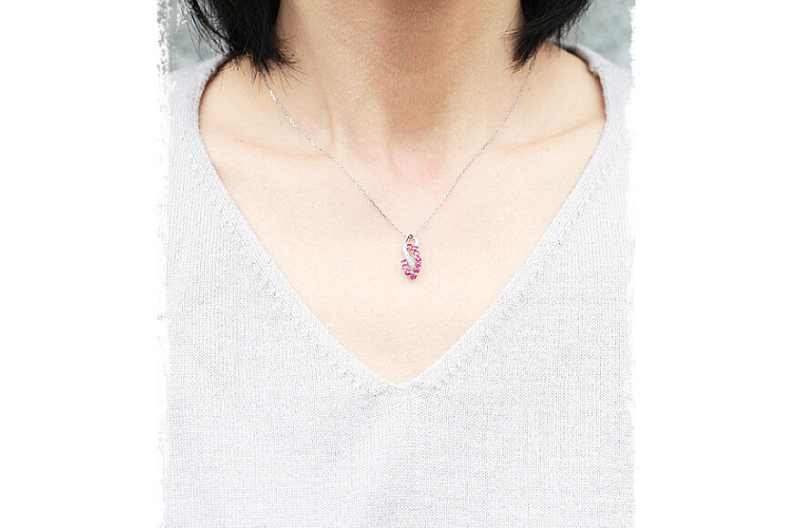 バチカンと一体になっているすっきりとしたモチーフに、美しく煌めくルビー10石と上品に輝くダイヤモンド5石 0.05ctを留めた優雅で華やかな仕上がり。
