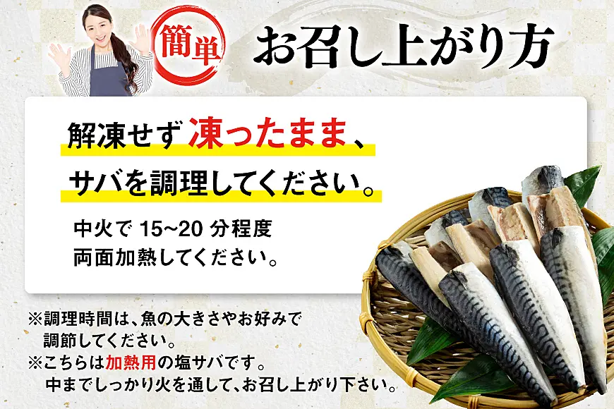 こちらは加熱用の塩サバです、中までしっかり火を通してからお召し上がりください。