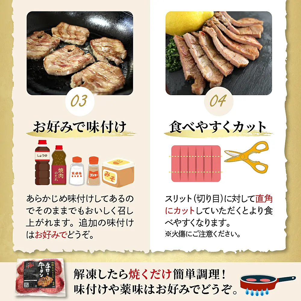 (2)…フライパンに薄くゴマ油をひいてから、牛タンの両面を焼き色が付くまで良く焼いてください。予め塩味で味付けしてありますが、お好みで塩等で味付けを行ってください。屋外でのバーベキューで炭焼きにしても、美味しくお召し上がり頂けます。)