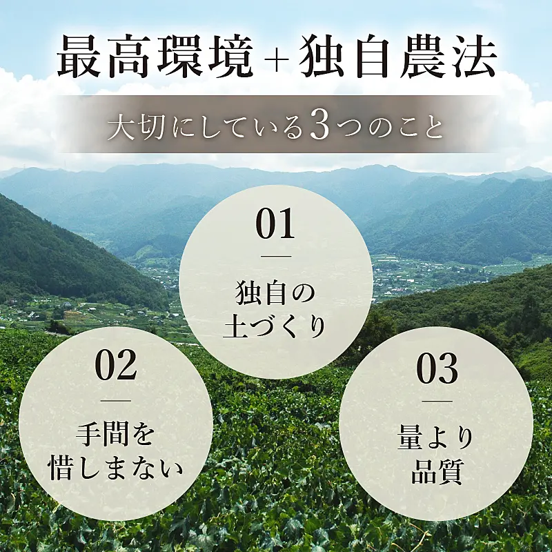 私たち雨宮ファームは、桃とぶどうの栽培を始めて60年になります。3代に渡り初代からの農法を受け継ぎ、新たな農法を組み合わせ「最高に美味しい」を追求しています。甲州市の中でも私たちの畑は標高約600~650mの場所にあり、日当たりの良さ、澄んだ空気、水、そして、昼夜の寒暖差が深みのある美味しさを生みます。「全てはお客様の笑顔のために」の理念のもと、この最高の環境で手間を惜しまず最高の美味しさに育てています。