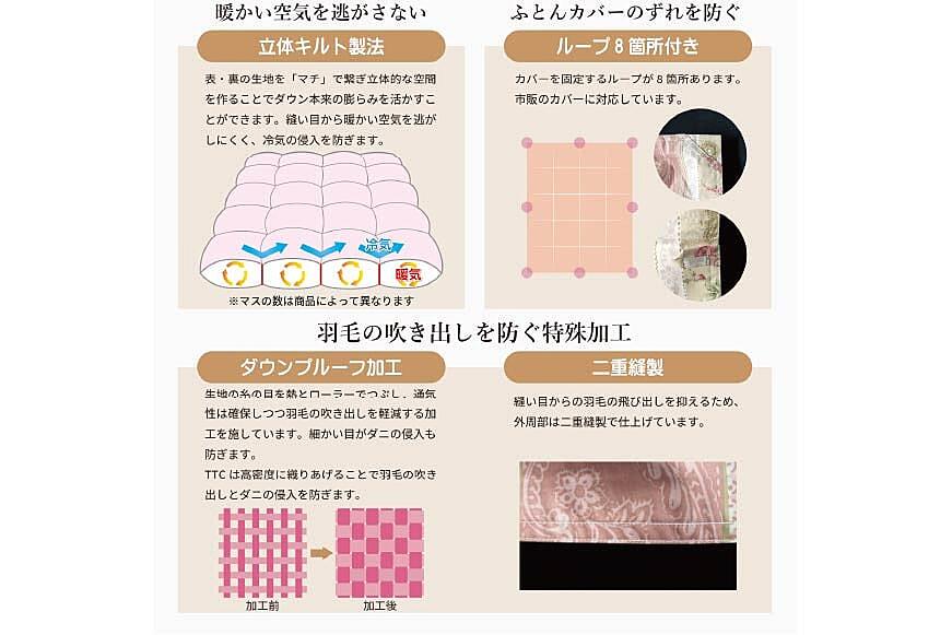 ※羽毛布団の特性上、縫い目や側生地からごく微量の羽毛が出てくることがありますが使用上問題はありません。