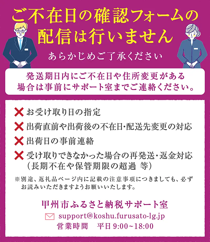 ・ご不在日や住所変更がある場合は、事前にサポート室までメールまたは電話にてご連絡ください。