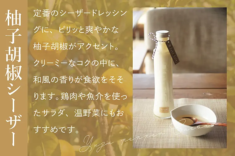 定番のシーザードレッシングに、ピリッと爽やかな柚子胡椒がアクセント。クリーミーなコクの中に、和風の香りが食欲をそそります。鶏肉や魚介を使ったサラダ、温野菜にもおすすめです。ちょっぴり大人の味わいをお楽しみください。