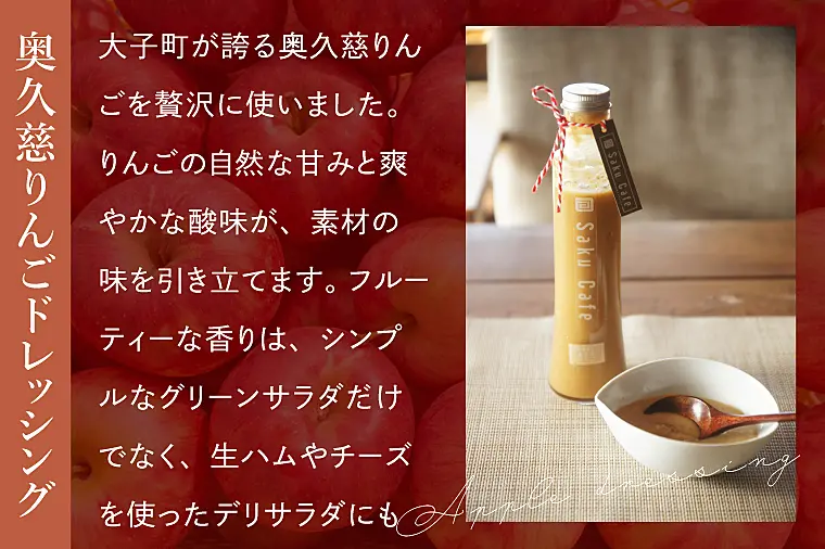 大子町が誇る奥久慈りんごを贅沢に使いました。りんごの自然な甘みと爽やかな酸味が、素材の味を引き立てます。フルーティーな香りは、シンプルなグリーンサラダだけでなく、生ハムやチーズを使ったデリサラダにもぴったりです。