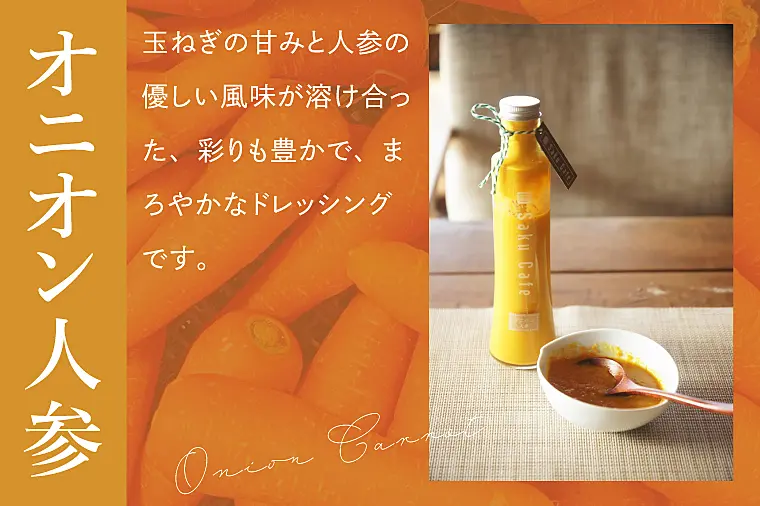 玉ねぎの甘みと人参の優しい風味が溶け合った、彩りも豊かで、まろやかなドレッシングです。
