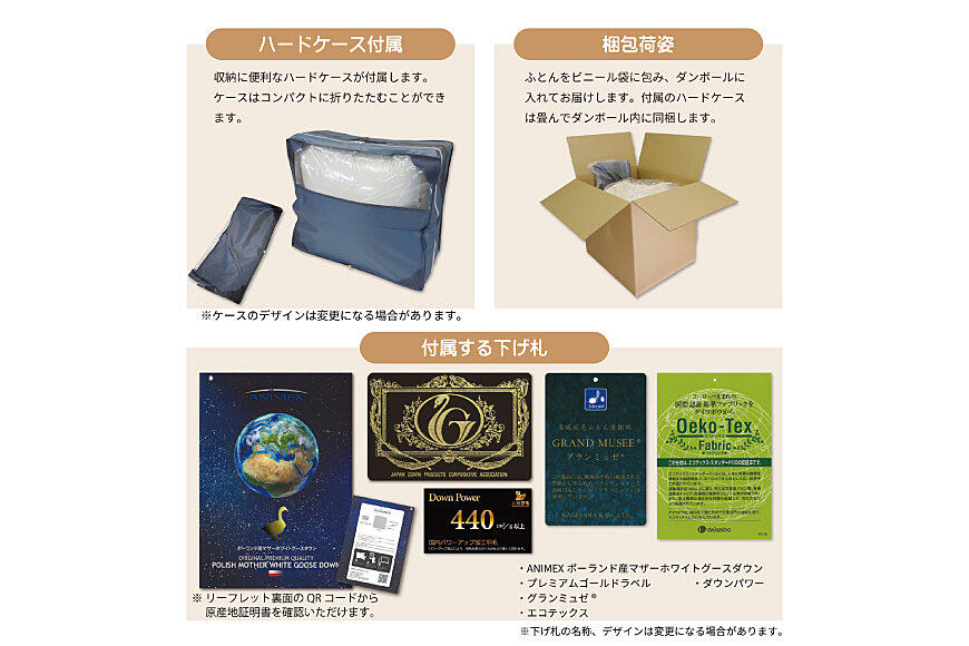 ポーランドグースを代表するブランド「Animex」社のマザーグースダウンと100番手×140番手の軽量サテン生地を使用。