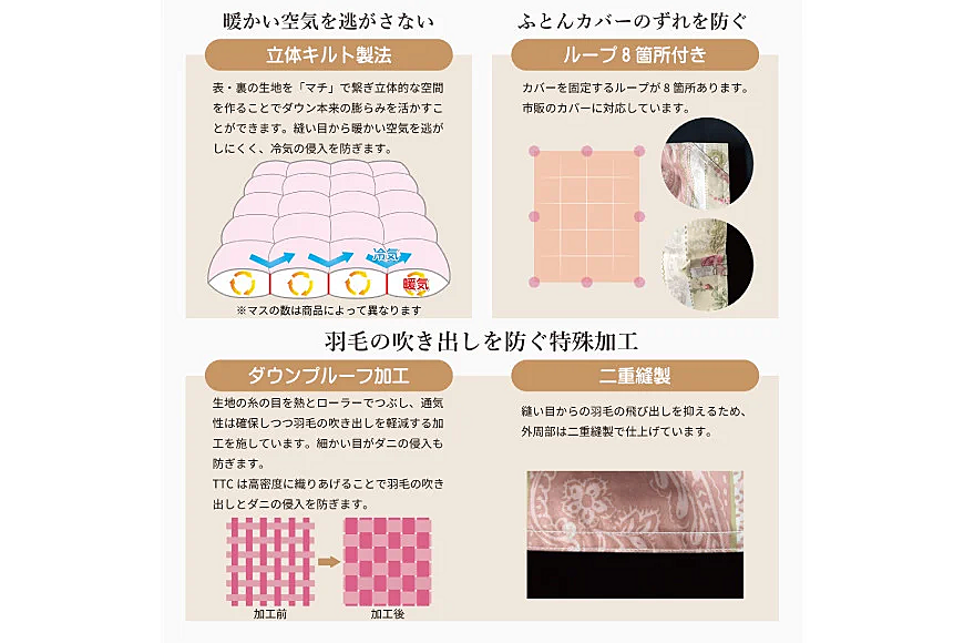 ※羽毛布団の特性上、縫い目や側生地からごく微量の羽毛が出てくることがありますが使用上問題はありません。