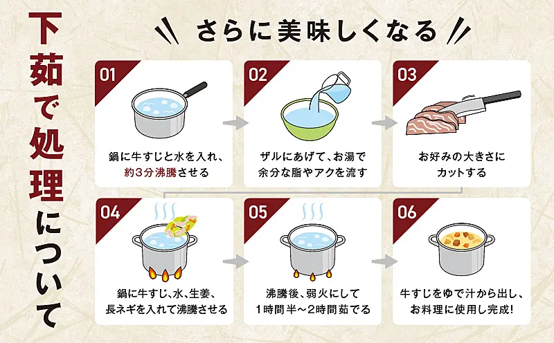 グルタミン酸の働きで、旨味と甘味がプラスされております。牛すじカレー、すじ煮込み、デミグラスソースなど、様々なお料理にご活用いただける「氷温熟成×極味付け」の牛すじをご堪能ください!