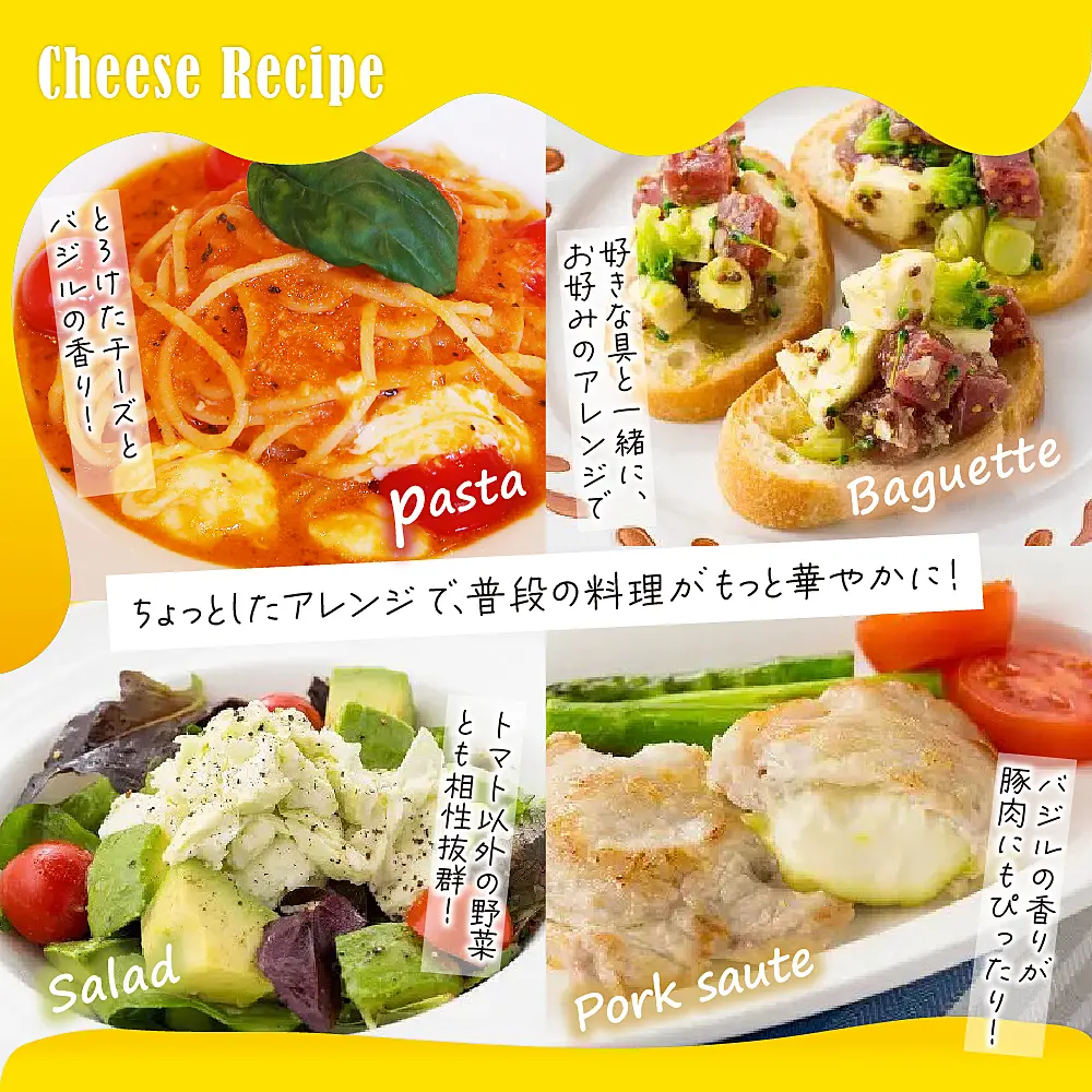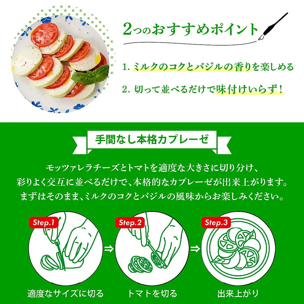 明治北海道十勝生モッツァレラ バジル仕立ては、カットしてトマトと並べるだけで、本格的なカプレーゼをお楽しみいただけます。