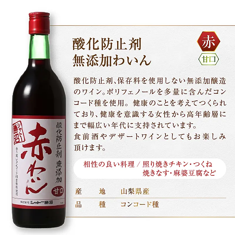 酸化防止剤、保存料を使用しない無添加醸造のワイン。ポリフェノールを多量に含んだコンコード種を使用。健康のことを考えてつくられており、健康を意識する女性から高年齢層にまで幅広い年代に支持されるシャトー勝沼の主力商品です。