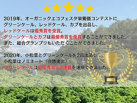 栄養価コンテストでは、抗酸化力、糖度、ビタミンCのどれもが突出した数値で、苦みのもととなる硝酸イオンは、ほぼ検出されませんでした。その結果、グランプリを4連覇させていただきました。