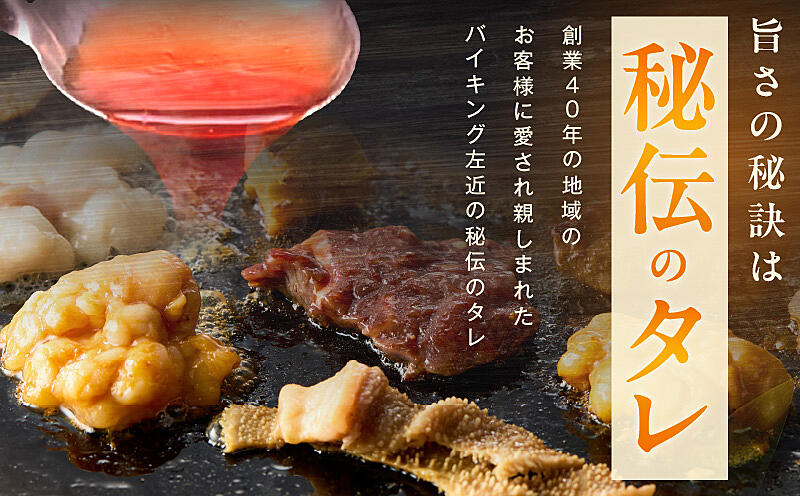 地域のお客様に愛され親しまれたバイキング左近の秘伝のたれで漬けこんだ「ホルモンミックス6種焼肉」です。ハラミ、センマイ、レバーには赤だれ、ミノと大腸は味噌だれ、さらにホルモン(小腸)には塩だれも用意し、合計6パック!