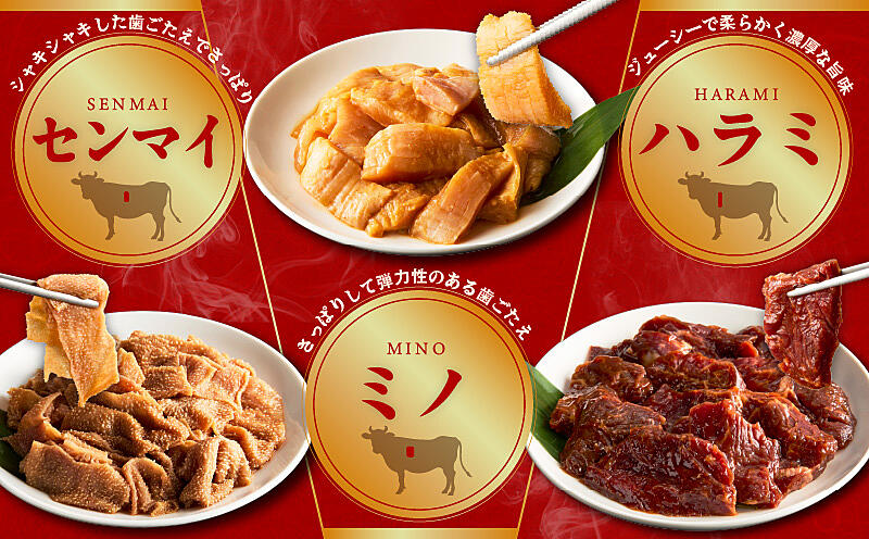ハラミ 250g×1P、ミノ 250g×1P、センマイ 250g×1P、レバー 250g×1P、小腸 250g×1P、大腸 250g×1P