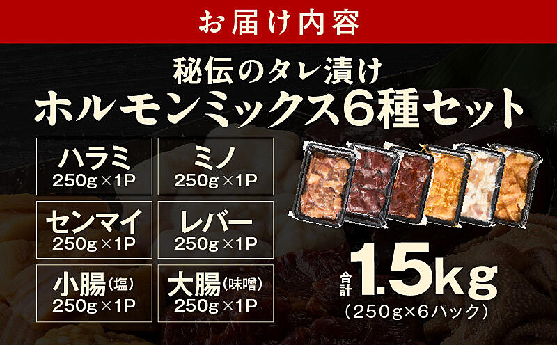 010B1629 ホルモンミックス 6種セット 合計 1.5kg 秘伝のタレ漬け【食べ比べ 250g×6種 小分け 焼肉 牛肉】