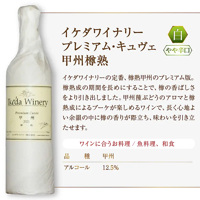 特徴:イケダワイナリーの定番、樽熟甲州のプレミアム版。樽熟成の期間を長めにすることで、樽の香ばしさをより引き出しました。甲州種ぶどうのアロマと樽熟成によるブーケが楽しめるワインで、長く心地よい余韻の中に樽の香りが際立ち、味わいを引き立たせます。