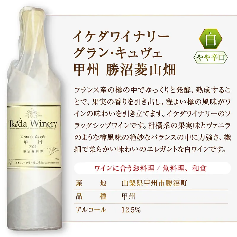 特徴:勝沼の中でも特に優良な産地として評価されている菱山地区の甲州種ぶどうを厳選。樽発酵した高級辛口白ワインです。10月中旬に収穫、フランス産の樽の中でゆっくりと発酵、熟成することで、果実の香りを引き出し、程よい樽の風味がワインの味わいを引き立てます。イケダワイナリーのフラッグシップワインです。