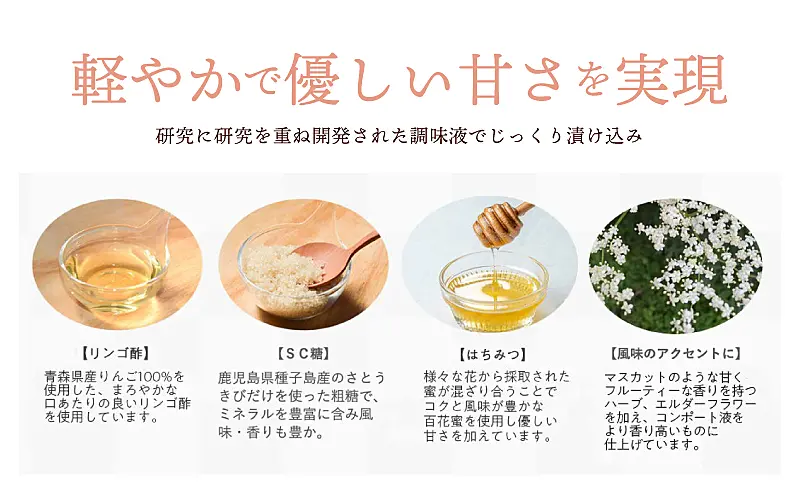 コンポートはヨーロッパの伝統的な果物の保存方法でジャムに比べ果物の持つ食感や風味が残って糖度も低いのが特徴です。いずみピクルスのコンポートはリンゴ酢も加えてくどくないすっきりとした甘さに仕上げました。