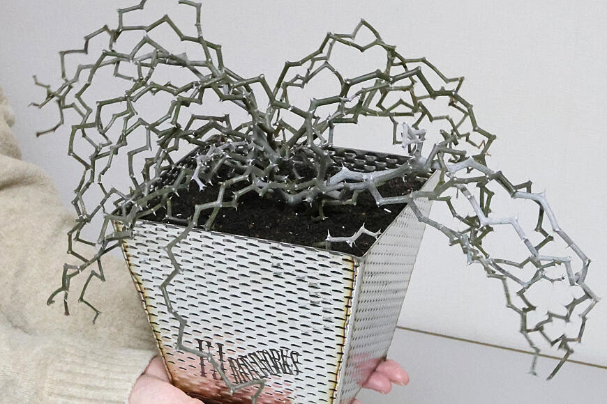 存在感のあるステンレス製の鉢は、個性的な植物と引き立て合います。