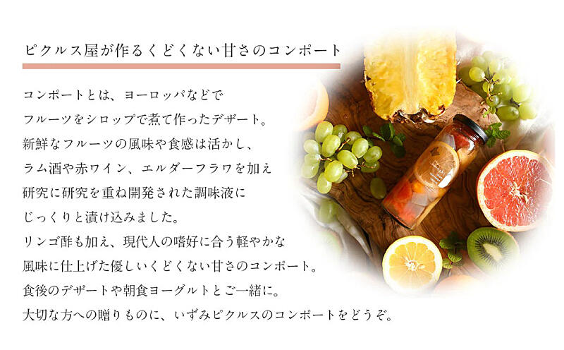 原材料名:グレープフルーツ、オレンジ、パイナップル、ぶどう、キウイ、レモン、ナタデココ、漬け原材料[りんご酢、粗糖、グラニュー糖、はちみつ、赤ワイン、ラム酒、香辛料(エルダーフラワー)]