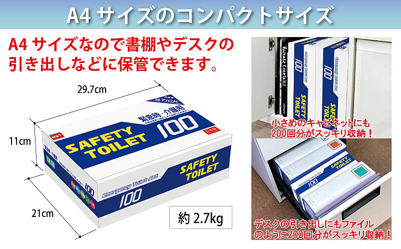 SAFETY TOILET 100STICKは地震などの災害時による断水時やドライブ中の渋滞・アウトドアや介護などの 緊急時の排泄問題を解消する為に開発された、水がなくても使用できる簡易トイレセットです。
