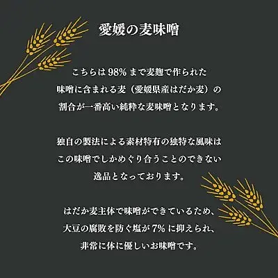 - はだか麦(愛媛県産)、大豆(愛媛県産)(遺伝子組み換えでない)、食塩(兵庫県産赤穂の塩)、酒精(酒精は粗ずり(スリ)味噌のみ使用)
