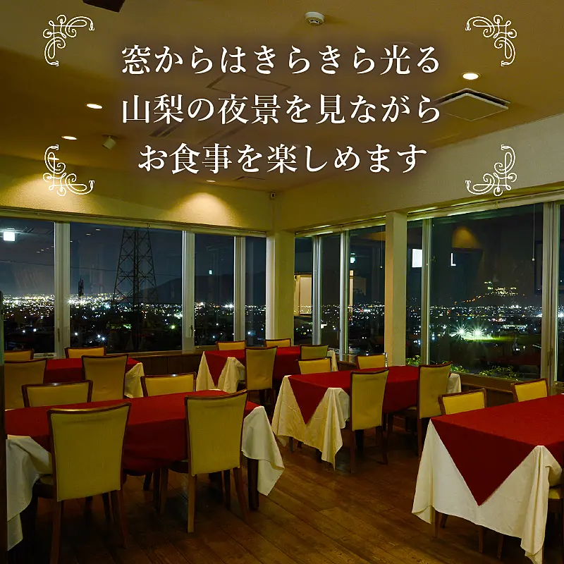 山梨県勝沼町にあるワイナリー「シャトー勝沼」に併設する直営店「レストラン鳥居平」。窓からはきらきら光る山梨の夜景を見ながらお食事を楽しむことができます。
