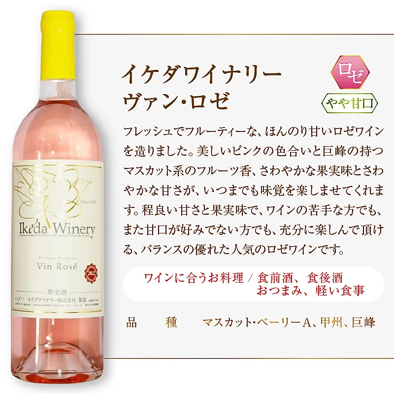 特徴:マスカット・ベーリーAと甲州、巨峰からフレッシュでフルーティーな、ほんのり甘いロゼワインを造りました。美しいピンクの色合いと巨峰の持つマスカット系のフルーツ香、さわやかな果実味とさわやかな甘さが、いつまでも味覚を楽しませてくれます。程良い甘さと果実味で、ワインの苦手な方でも、また甘口が好みでない方でも、充分に楽しんで頂ける、バランスの優れた人気のロゼワインです。