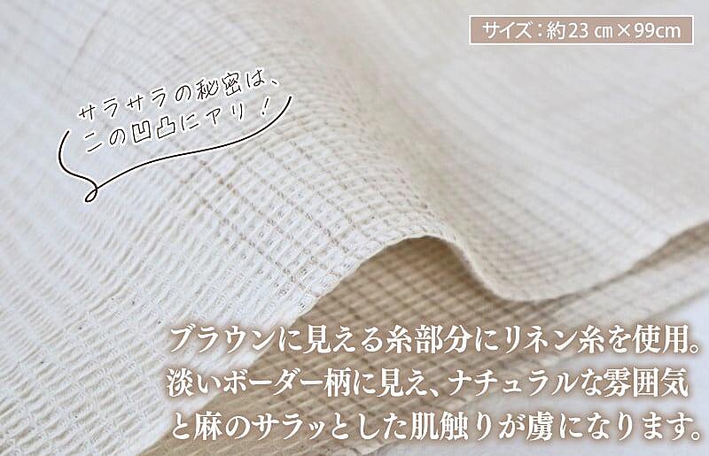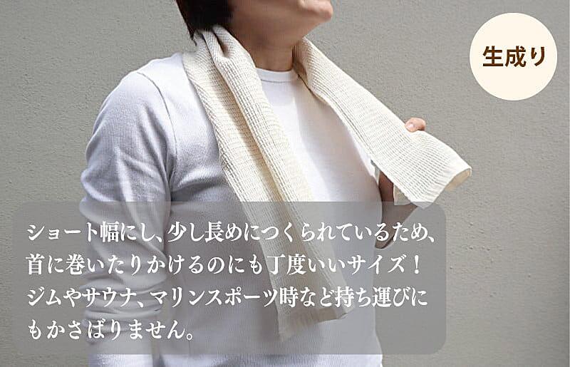 ショート幅にし少し長めにつくられているため、首に巻いたりかけるのにも丁度いいサイズ感。ジムやサウナ、マリンスポーツ時など持ち運びにもかさばりません。ブラウンに見える糸部分にリネン糸を使用。