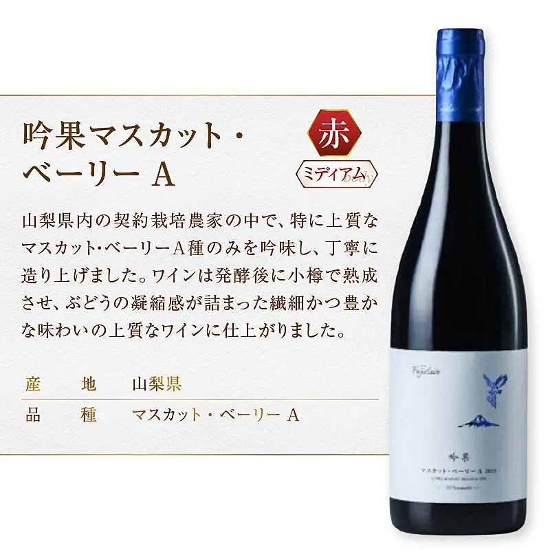 特徴:山梨県内の契約栽培農家の中で、特に上質なマスカット・ベーリーA種のみを吟味し、丁寧に造り上げました。ワインは発酵後に小樽で熟成させ、ぶどうの凝縮感が詰まった繊細かつ豊かな味わいの上質なワインに仕上がりました。