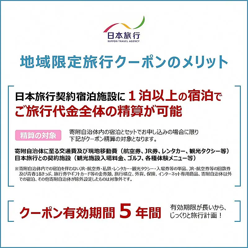 現地までの交通費や現地での観光・体験等の精算にまで幅広く利用できる地域限定旅行クーポンです。