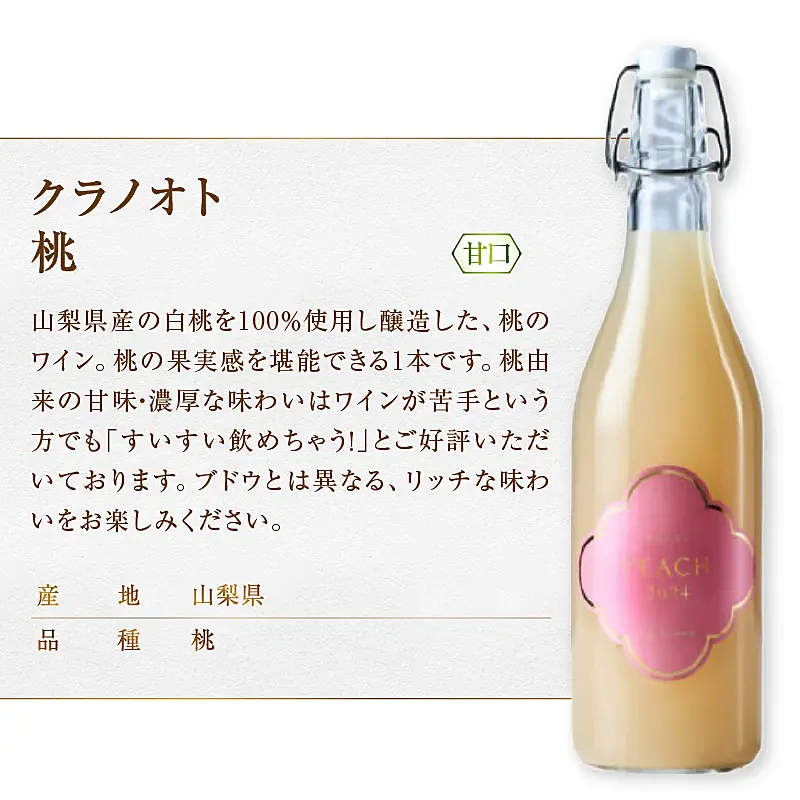 特徴:山梨県産の白桃を100%使用し醸造した、桃のワイン。桃の果実感を堪能できる1本です。桃由来の甘味・濃厚な味わいはワインが苦手という方でも「すいすい飲めちゃう!」とご好評いただいております。ブドウとは異なる、リッチな味わいをお楽しみください。