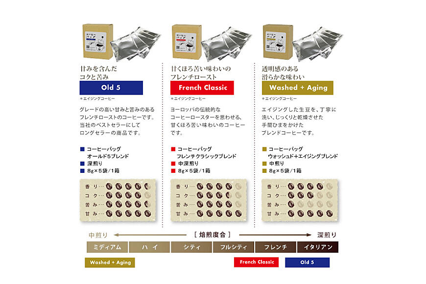 焙煎度の違う3種類を合計15袋お楽しみ頂けます。