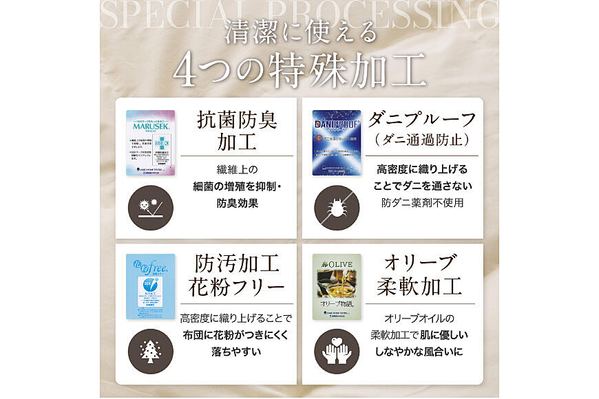 ※羽毛布団の特性上、縫い目や側生地からごく微量の羽毛が出てくることがありますが使用上問題はありません。
