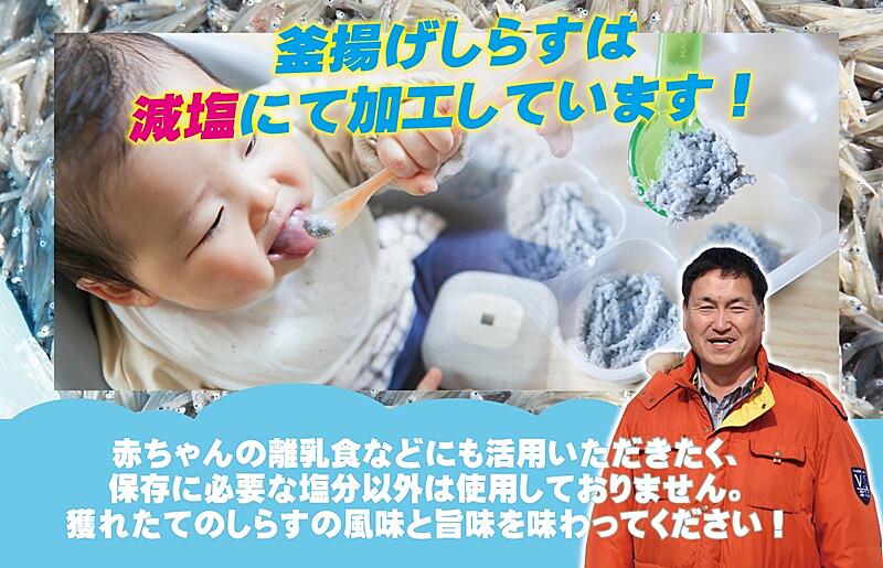 泉佐野でしらす漁を操業して35年以上を誇るベテランしらす漁師が、自分で獲ったしらすの中から上質なものを目利きの上、泉佐野市内で釜揚げ加工し、急速冷凍の上、お送りいたします。こだわりは、水揚げした直後の沖合の漁船内でできうる丁寧な洗浄と迅速な氷締めを徹底していることで、鮮度抜群のしらすの風味や食感を味わっていただけること。また、しらす本来の新鮮な味を堪能いただくべく、加工には保存に最低限必要な塩のみ使用した減塩にて釜揚げしております。