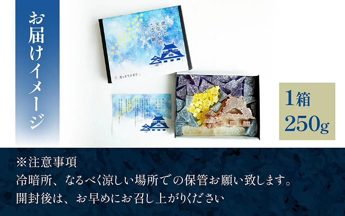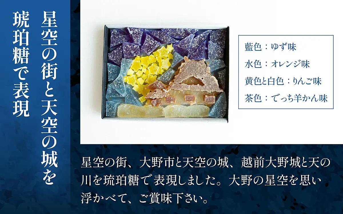 星の街大野。星空と天空の城と、キラキラこはく糖で美味しく出来上がっています。 ぜひ、一つ一つ違う、かわいく、美味しい星やお城たちを ぜひご賞味ください。
