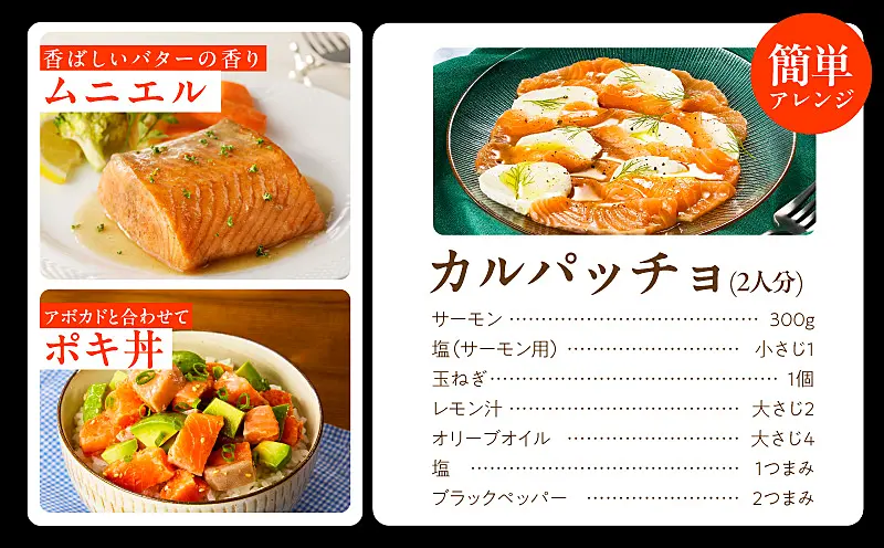 ブロックタイプですので、贅沢に厚切りにしてお刺身で、薄切りにしてカルパッチョ、ダイス状にカットしてサーモン丼など、お好みの厚み・形でお召し上がりいただけます。