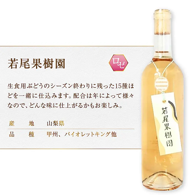 特徴:生食用ぶどうのシーズン終わりに残った15種ほどを一緒に仕込みます。配合は年によって様々なので、どんな味に仕上がるかもお楽しみ。
