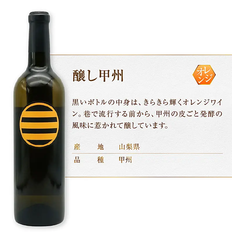 特徴:黒いボトルの中身は、きらきら輝くオレンジワイン。巷で流行する前から、甲州の皮ごと発酵の風味に惹かれて醸しています。